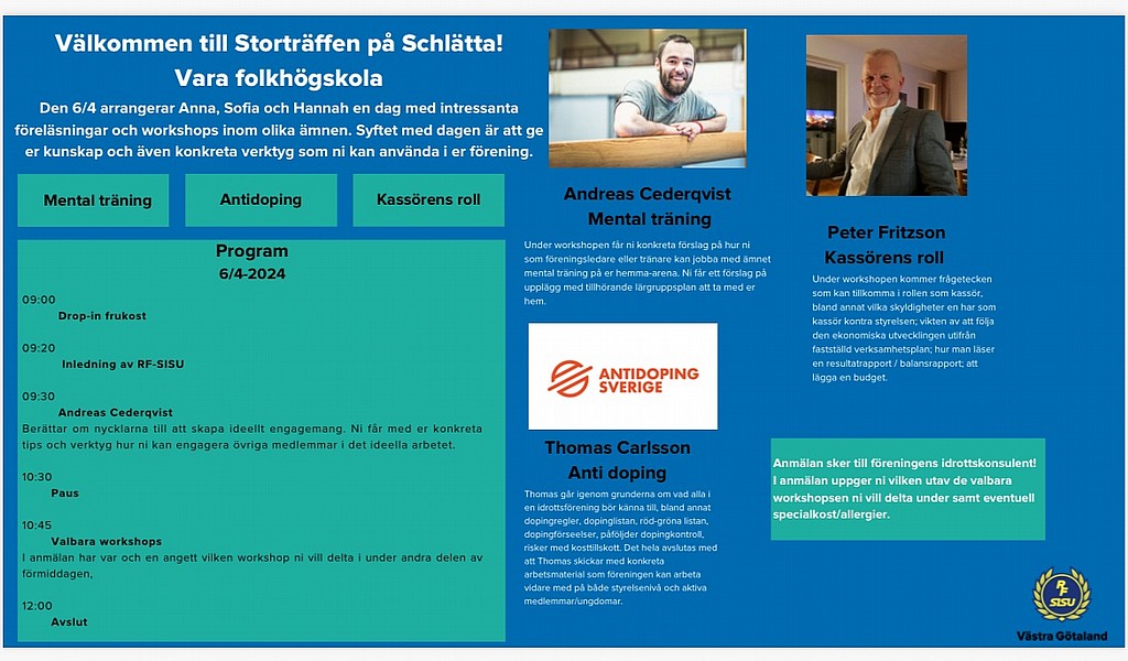 Storträffen på Schlätta arrangerar SISU på Vara Folkhögskola den 6/4.